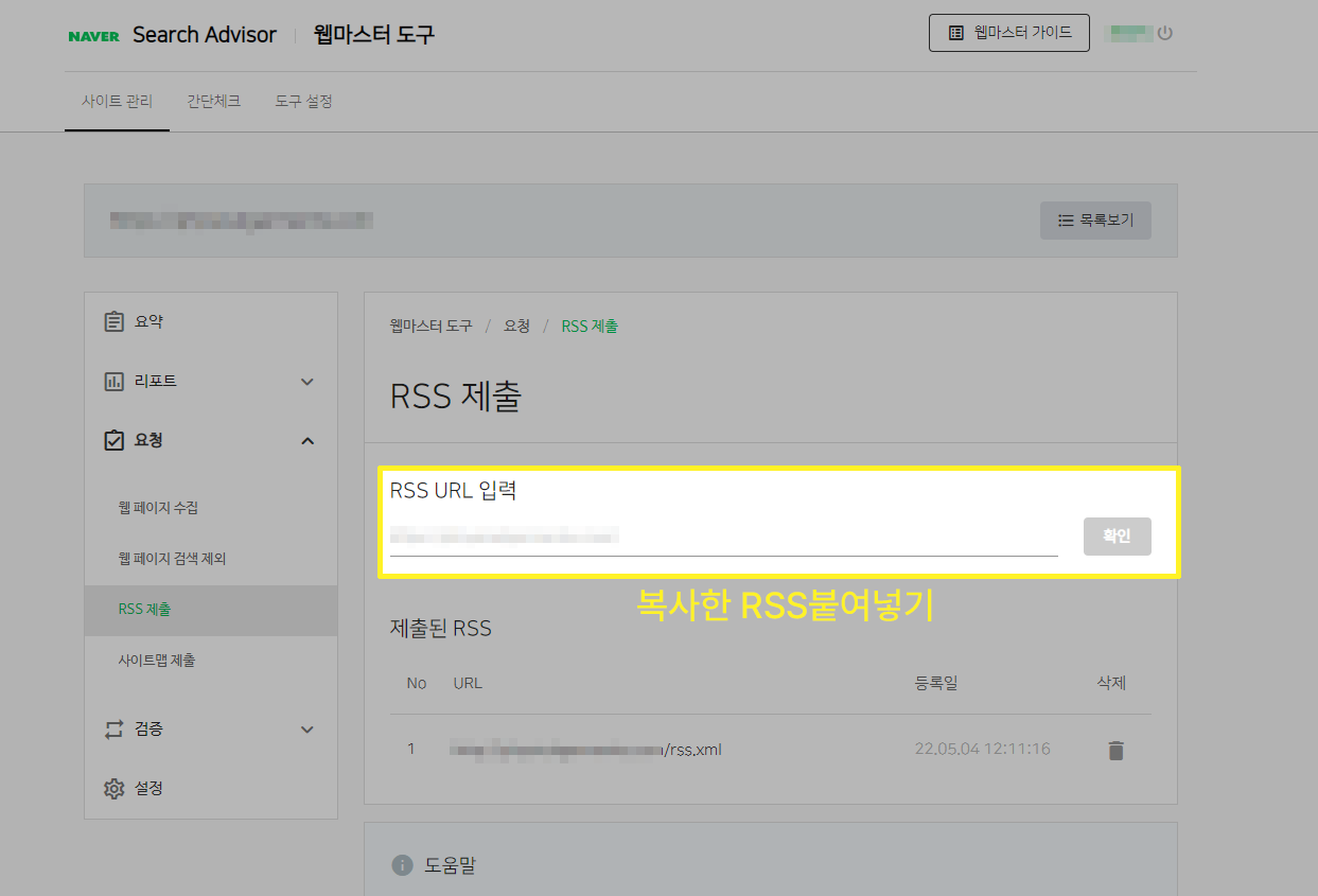 RSS주소를 붙여넣기하고 확인버튼을 눌러주세요 .