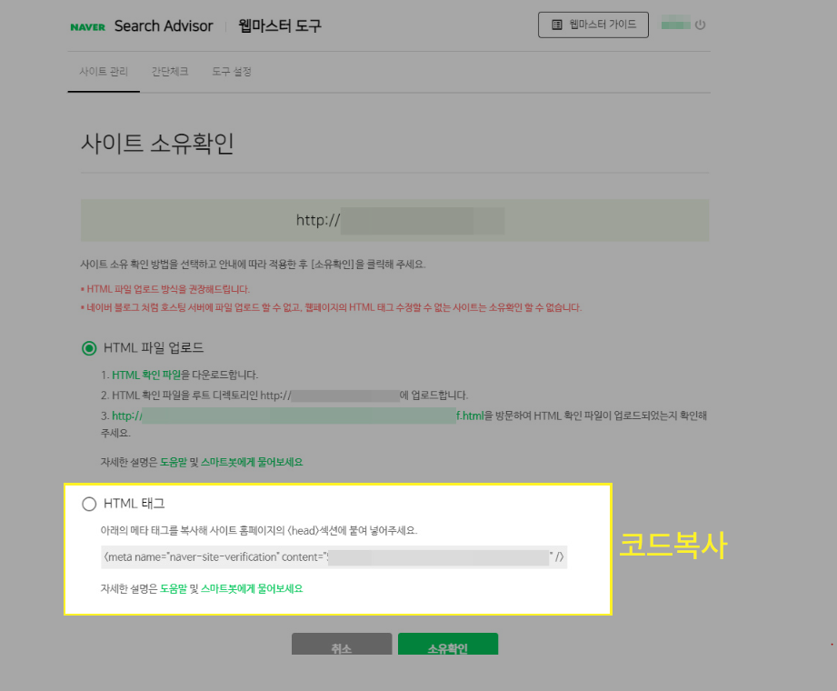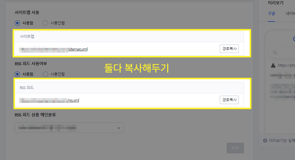 사이트맵과 RSS피드의 주소를 복사해둬 주세요 !