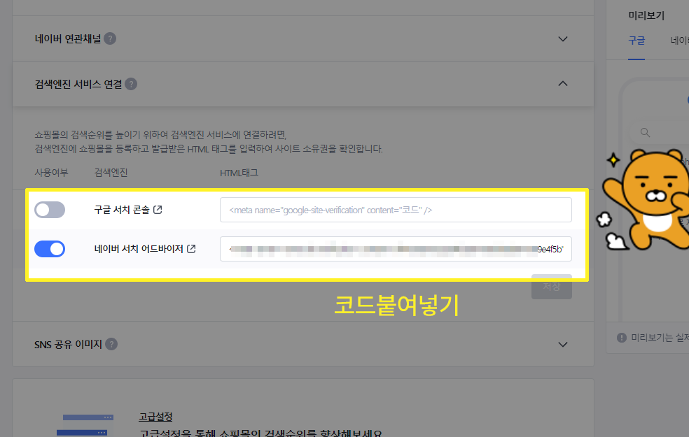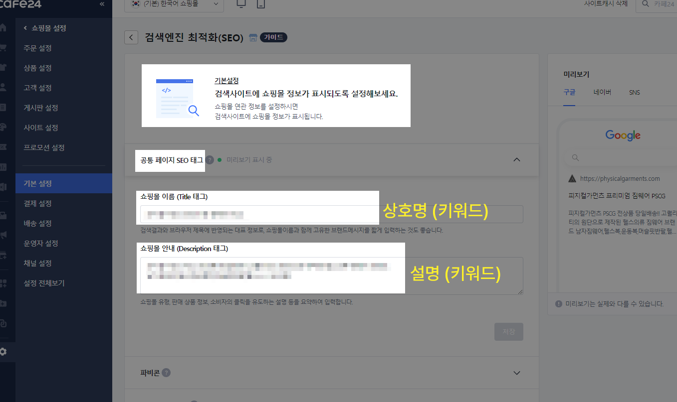 여기서부터 카페24 SEO최적화, 즉 검색엔진 최적화작업의