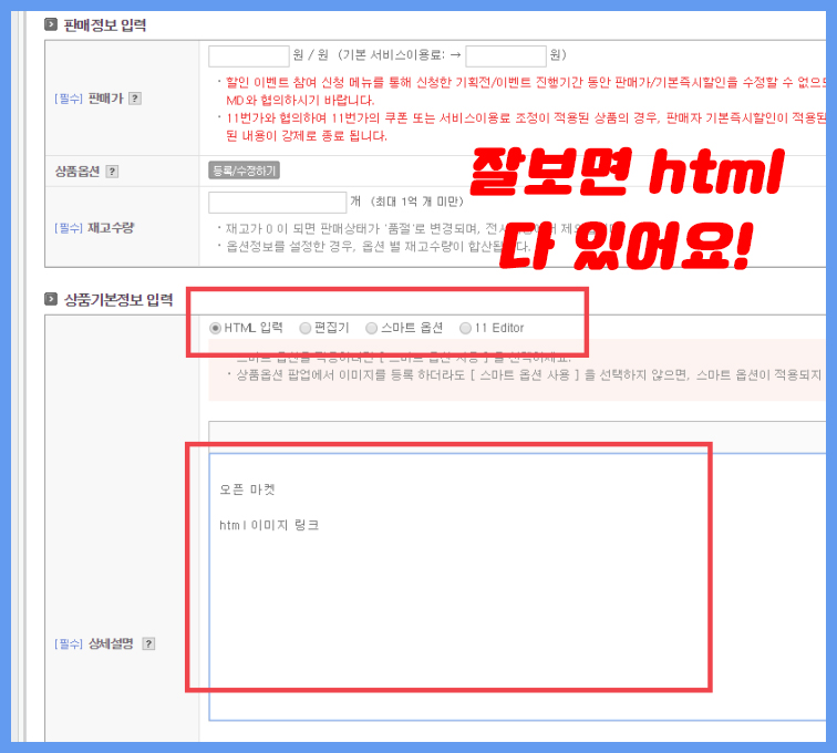 html 입력할 수 있는공간이나 html입력방식으로 바꿔주신뒤